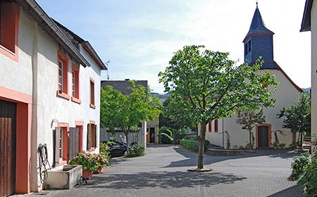 liegt der alte traditionsreiche Weinort Schleich, ein kleines Moselörtchen mit nur 220 Einwohnern. 976 wurde der Ort erstmals erwähnt in einer Schenkungsurkunde, in der Erzbischof Theoderich von Trier dem Kloster St. Martin das Dorf übereignete. Die Staustufe Detzem-Schleich ist mit 9 Meter Höhe übrigens die höchste Staustufe der Mosel.